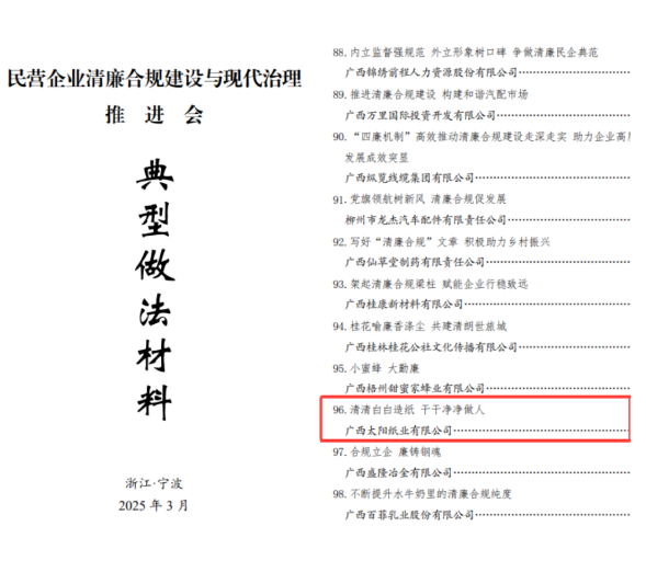 3月26日,全國工商聯(lián)民營企業(yè)清廉合規(guī)建設(shè)與現(xiàn)代治理推進(jìn)會在浙江寧波鄞州舉行。其中,廣西太陽紙業(yè)有限公司清廉建設(shè)工作取得的扎實(shí)成效受到高度認(rèn)可,《清清白白造紙 干干凈凈做人》成功入選本次推進(jìn)會典型做法交流材料。