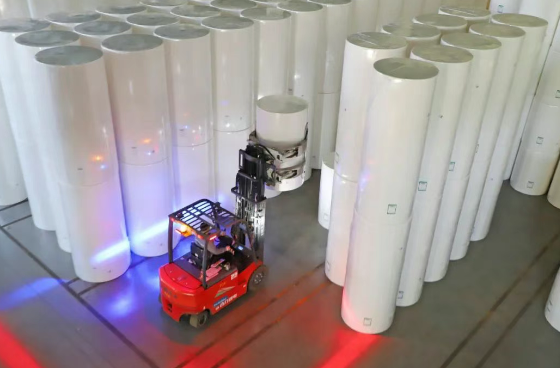 ▲亞太森博(山東)漿紙有限公司生活紙倉儲車間內(nèi)工作人員正在駕駛抱車搬運卷筒紙