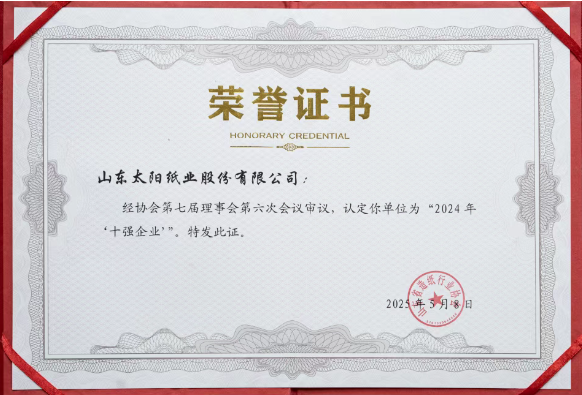 2025年5月8日-9日,以“創(chuàng)新驅(qū)動(dòng)、綠色發(fā)展”為主題的“2025山東省造紙行業(yè)年會(huì)暨山東省造紙產(chǎn)業(yè)綠色低碳高質(zhì)量發(fā)展大會(huì)”在山東德州成功召開(kāi)。會(huì)上,中國(guó)造紙協(xié)會(huì)副理事長(zhǎng)、山東省造紙行業(yè)協(xié)會(huì)專(zhuān)職副會(huì)長(zhǎng)趙振東宣讀了《山東協(xié)會(huì)認(rèn)定“雙十”標(biāo)桿企業(yè)——山東省造紙行業(yè)協(xié)會(huì)“2024年‘十強(qiáng)企業(yè)’‘十佳企業(yè)’”通報(bào)》,其中,山東太陽(yáng)紙業(yè)股份有限公司被認(rèn)定為“2024年‘十強(qiáng)企業(yè)’”。