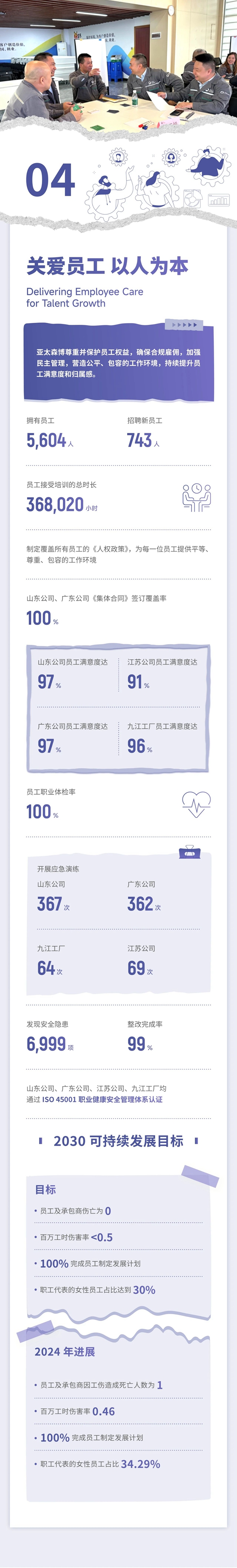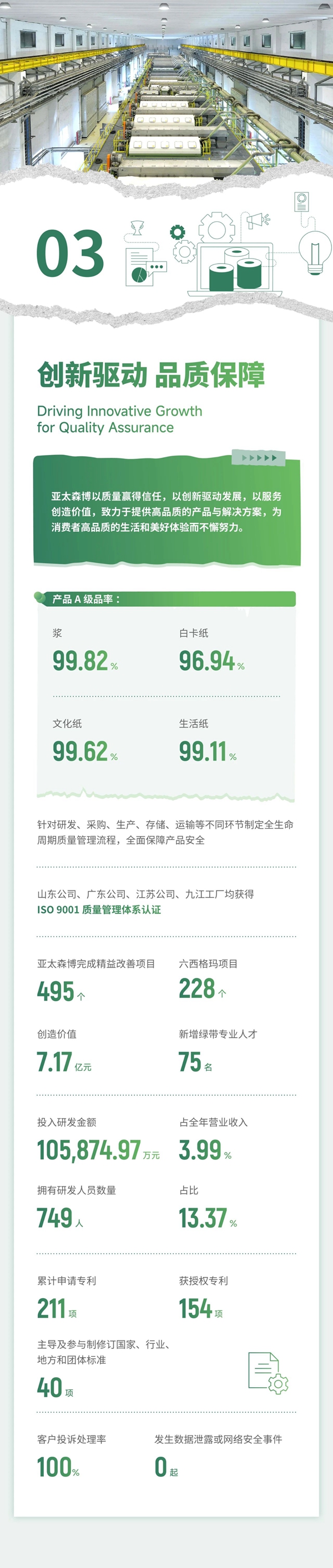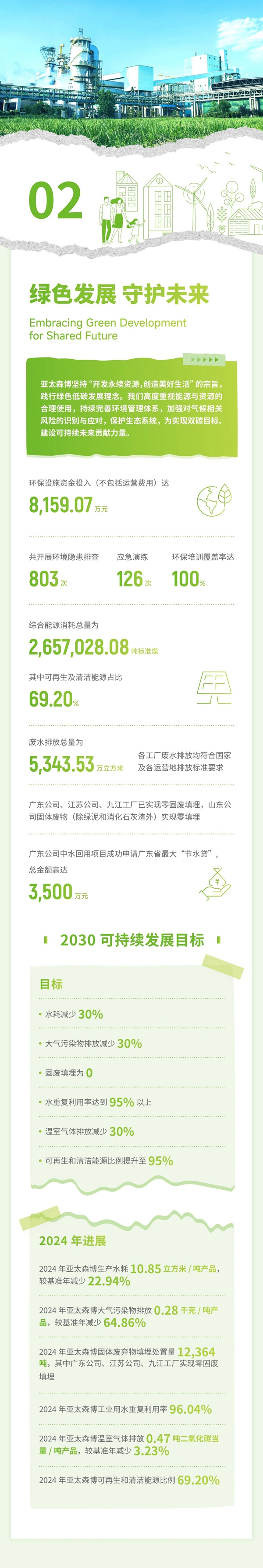 報(bào)告通過“誠信經(jīng)營穩(wěn)健前行”“綠色發(fā)展守護(hù)未來”“創(chuàng)新驅(qū)動(dòng)品質(zhì)保障”“關(guān)愛員工以人為本”“協(xié)同發(fā)展和諧前行”等章節(jié),用詳實(shí)的數(shù)據(jù)和案例全面展示了亞太森博2024年度可持續(xù)發(fā)展績效,系統(tǒng)回應(yīng)了各利益相關(guān)方關(guān)注的實(shí)質(zhì)性議題,表達(dá)了亞太森博愿與所有利益相關(guān)方攜手共進(jìn),共同書寫美好未來的信心和決心。