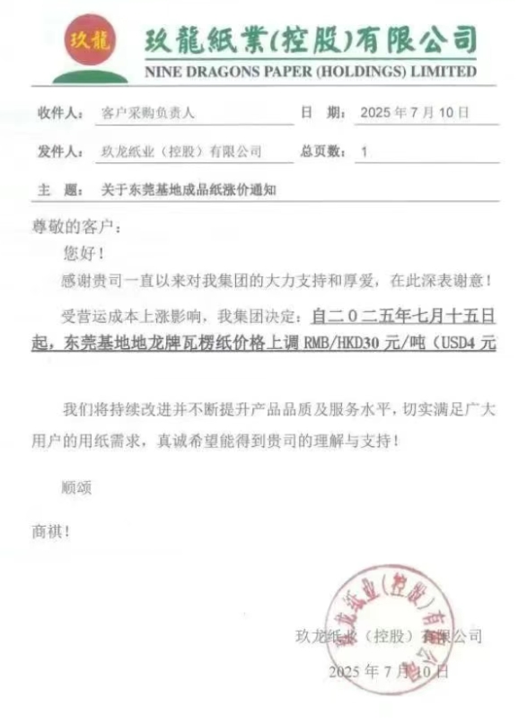 自7月15日起,東莞基地地龍牌瓦楞紙價(jià)格上調(diào)RMB/HKD 30元/噸(USD4元)。