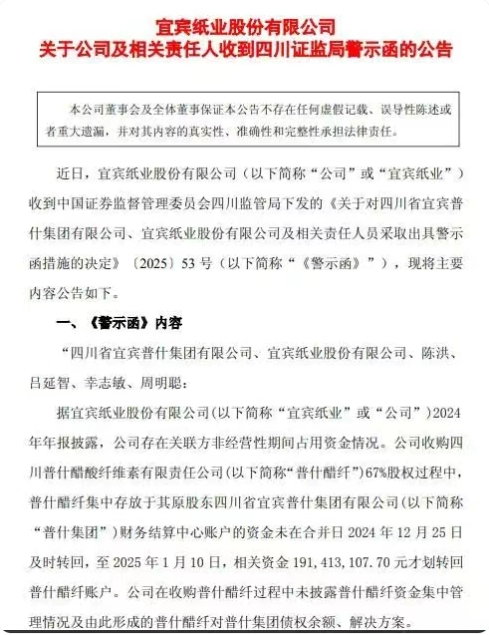 7月18日,宜賓紙業(yè)(600793.SH)發(fā)布公告,因在重大資產(chǎn)收購(gòu)中未及時(shí)披露1.91億元資金滯留及關(guān)聯(lián)交易問(wèn)題,收到四川證監(jiān)局警示函。 值得關(guān)注的是,就在三天前的7月15日,該公司剛發(fā)布2025年上半年凈利潤(rùn)預(yù)增1865萬(wàn)至2280萬(wàn)元的業(yè)績(jī)喜訊。監(jiān)管警示與業(yè)績(jī)回暖的同期出現(xiàn),暴露出這家老牌造紙企業(yè)在擴(kuò)張過(guò)程中內(nèi)控治理與經(jīng)營(yíng)能力的失衡風(fēng)險(xiǎn)。 1.91億資金滯留遭警示 被記入誠(chéng)信檔案 據(jù)警示函顯示,宜賓紙業(yè)2024年末以收購(gòu)普什醋纖67%股權(quán)為標(biāo)志的產(chǎn)業(yè)擴(kuò)張存在重大程序瑕疵。作為交易核心的標(biāo)的公司普什醋纖,其存放在原股東普什集團(tuán)財(cái)務(wù)結(jié)算中心的1.91億元資金,未按會(huì)計(jì)準(zhǔn)則要求于2024年12月25日合并日完成劃轉(zhuǎn),直至2025年1月10日才完成資金歸位。這16天的資金滯留形成事實(shí)上的關(guān)聯(lián)方非經(jīng)營(yíng)性占款,直接違反《上市公司監(jiān)管指引第8號(hào)》關(guān)于資金往來(lái)的剛性約束。 更值一提的是,按照《上市公司信息披露管理辦法》第三條要求,可能對(duì)投資者決策產(chǎn)生重大影響的關(guān)聯(lián)交易必須完整披露。但宜賓紙業(yè)在收購(gòu)公告中,既未說(shuō)明普什醋纖與普什集團(tuán)的資金歸集安排,也未披露由此形成的1.91億元債權(quán)關(guān)系,導(dǎo)致投資者無(wú)法準(zhǔn)確評(píng)估收購(gòu)標(biāo)的的真實(shí)財(cái)務(wù)狀態(tài)。