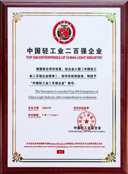 中國輕工業聯合會本著嚴謹、公正、科學的原則,通過對申報企業2024年度營業收入、利潤總額、利稅總額、科技研發投入及專利數量等指標進行統計,按統一標準體系進行評定并發布了2024年度中國輕工業二百強企業、行業十強企業等名單。