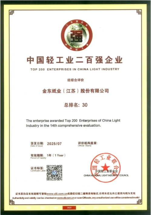 金東紙業(江蘇)股份有限公司以科技創新和綠色制造的新質生產力推動企業轉型升級獲得了中國輕工業聯合會的認可,榮膺“2024年度中國輕工業二百強企業”(位列第30名)、“中國輕工業造紙行業十強企業”(位列第5名)兩項殊榮。這是該榜單自2011年開始發布以來,金東連續十四年入選。