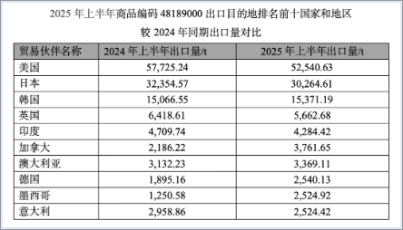 生活用紙 出口 2025年上半年,生活用紙出口量77.83萬t,較2024年同期增長19.06%,出口金額12.19億美元,較2024年同期下降1.77%,呈現量增價跌的趨勢。出口產品仍以成品為主,2025年上半年成品占總出口量的69.41%(2024年上半年為69.06%),較2024年同期有所增長。成品紙中手帕紙、面巾紙出口量增長最快,為33.86%。 進口 2025年上半年,生活用紙總進口量比2024年同期有所增長,但進口量很少,只有2.23萬t;進口產品中仍然以原紙為主,占總進口量的90.57%。 吸收性衛生用品 出口 2025年上半年,吸收性衛生用品的總出口量為84.04萬t,出口金額為22.03億美元,均保持雙位數增長,分別增長16.01%和11.00%。出口產品中仍以嬰兒紙尿褲為主,占出口總量的42.83%,嬰兒紙尿褲出口量為35.99萬t,同比增長24.07%。 其中,寵物墊、護理墊等衛生用品出口對應的商品編碼48189000(紙漿、紙等制的其他家庭、衛生或醫院用品)下的產品出口量,2025年上半年較2024年同期減少4.068.60t,為近年來首次下降,分析原因是美國加征關稅對我國二季度出口帶來一定的影響,該編碼下產品出口目的地排名第一的美國的出口量2025年上半年較2024年同期減少5.184.61t。
