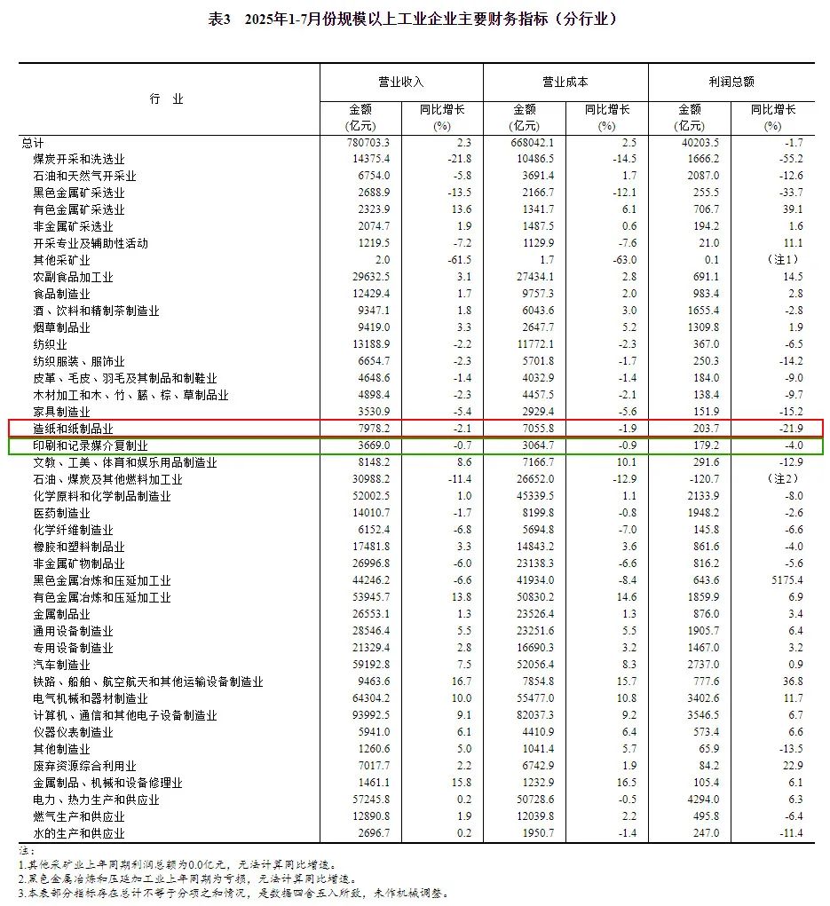 值得關注的是,造紙和紙制品業實現利潤總額203.7億元,同比下降21.9%;印刷和記錄媒介復制業實現利潤總額179.2億元,同比下降4.0%。 1—7月份,規模以上工業企業實現營業收入78.07萬億元,同比增長2.3%;發生營業成本66.80萬億元,增長2.5%;營業收入利潤率為5.15%,同比下降0.21個百分點。其中,造紙和紙制品業實現營業收入7978.2億元,同比下降2.1%;印刷和記錄媒介復制業實現營業收入3669.0億元,同比下降0.7%。 7月末,規模以上工業企業資產總計183.67萬億元,同比增長4.9%;負債合計106.26萬億元,增長5.1%;所有者權益合計77.41萬億元,增長4.6%;資產負債率為57.9%,同比上升0.2個百分點。 7月末,規模以上工業企業應收賬款26.84萬億元,同比增長6.8%;產成品存貨6.67萬億元,增長2.4%。 1—7月份,規模以上工業企業每百元營業收入中的成本為85.57元,同比增加0.24元;每百元營業收入中的費用為8.38元,同比減少0.08元。 7月末,規模以上工業企業每百元資產實現的營業收入為74.0元,同比減少1.9元;人均營業收入為182.6萬元,同比增加5.4萬元;產成品存貨周轉天數為20.5天,同比增加0.2天;應收賬款平均回收期為69.8天,同比增加3.7天。 7月份,規模以上工業企業利潤同比下降1.5%。 國家統計局工業司統計師于衛寧解讀2025年7月份工業企業利潤數據表示,7月份,規模以上工業生產保持穩定增長,促進物價水平合理回升系列政策逐步落地實施,帶動企業盈利水平持續恢復。規模以上工業企業效益狀況呈現以下特點:工業企業營業收入保持增長,利潤降幅連續收窄;制造業利潤較快增長,對規上工業利潤恢復貢獻較大;高技術制造業利潤快速增長,引領作用明顯;“兩新”政策成效顯著,持續帶動行業利潤增長;中小型企業利潤改善明顯,私營企業高于全國平均水平。