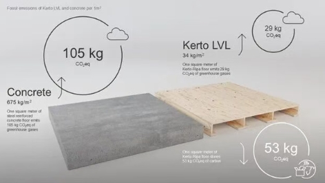而在墻體結(jié)構(gòu)中,兩者的差異表現(xiàn)為: Kerto LVL 的化石氣候影響(單位:CO₂e/m²,二氧化碳當(dāng)量 公斤/平米)為 52 kg CO₂e/m²,鋼筋混凝土為 68 kg CO₂e/m²。 材料使用量(單位kg/m²,公斤/平米)分別為 60 kg/m² 與 463 kg/m²,Kerto LVL 減少了超過80%的材料重量。