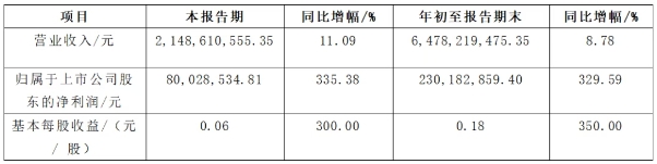 2025年第三季度,公司營業收入約21.49億元,同比增長11.09%。歸屬于上市公司股東的凈利潤約8.002.85萬元,同比增長335.38%。基本每股收益0.06元/股,同比增長300.00%。