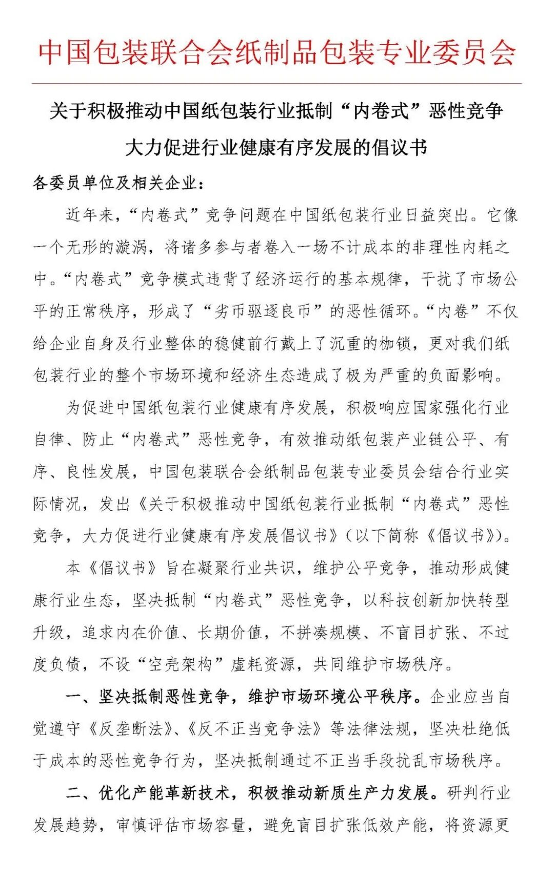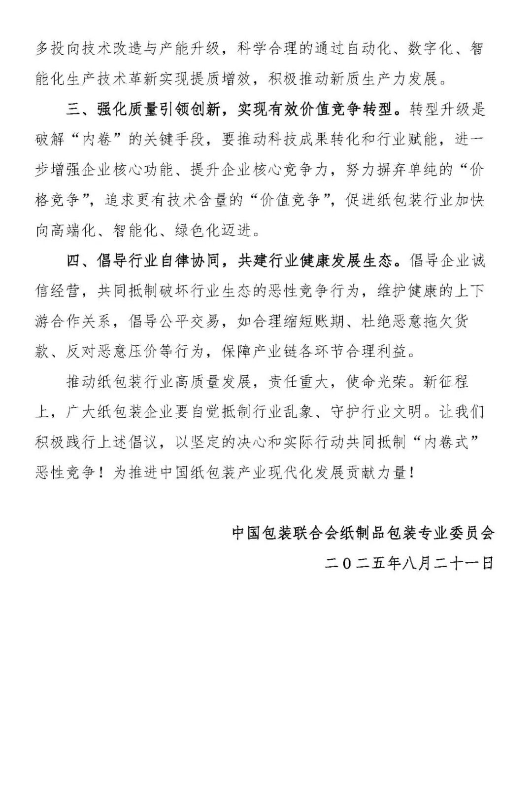 10月31日,“2025中國(guó)包裝聯(lián)合會(huì)紙制品包裝專(zhuān)業(yè)委員會(huì)年度委員大會(huì)”在佛山隆重舉行。會(huì)上,中國(guó)包裝聯(lián)合會(huì)紙制品包裝專(zhuān)業(yè)委員會(huì)張耀權(quán)常務(wù)副主任兼秘書(shū)長(zhǎng)宣讀了《關(guān)于中國(guó)紙包裝行業(yè)抵制“內(nèi)卷式”惡性競(jìng)爭(zhēng),促進(jìn)行業(yè)健康有序發(fā)展的倡議書(shū)》——呼吁全行業(yè)采取行動(dòng),遏制“內(nèi)卷式”競(jìng)爭(zhēng),推動(dòng)行業(yè)走向更加健康、可持續(xù)的發(fā)展軌道。