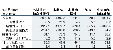 總裁兼首席執(zhí)行官萬友熙(Jussi Vanhanen)表示: 芬林集團 2025 年第三季度財務(wù)表現(xiàn)的亮點是經(jīng)營活動產(chǎn)生的現(xiàn)金流,凈額為正并超過 2 億歐元。尤其是在紙板業(yè)務(wù)方面,為降低營運資金而采取的相關(guān)措施按計劃順利實施。 正如預(yù)期,第三季度的經(jīng)營業(yè)績錄得明顯虧損。造成該結(jié)果的主要原因是木漿市場——尤其是在中國——價格低迷,以及美國市場紙板業(yè)務(wù)量的下降。這兩項因素均可歸因于春季全球貿(mào)易中出現(xiàn)的保護主義趨勢。美國對中國加征關(guān)稅,直接影響了中國的木漿需求,導(dǎo)致訂單暫停進而引發(fā)木漿價格下跌。在第三季度,芬林集團的木漿產(chǎn)品交付量較上一季度的低谷有所回升,但仍低于第一季度的水平。中國市場的價格水平尚未恢復(fù),木漿業(yè)務(wù)的疲弱業(yè)績表現(xiàn)印證了這一趨勢。 美國加征的關(guān)稅對芬林紙板的業(yè)績造成了明顯沖擊。自春季訂單量驟降以來,美國市場的訂單流入僅出現(xiàn)有限回升。由于當?shù)厥袌霏h(huán)境限制,集團未能提高客戶價格以抵消關(guān)稅帶來的影響。上述因素,加之漿價低迷,尤其影響了芬林紙板瑞典胡蘇姆(Husum)工廠的盈利能力。辛佩萊和胡蘇姆工廠的年度停機維護亦進一步削弱了紙板業(yè)務(wù)的盈利水平。 在生活用紙業(yè)務(wù)方面,第三季度的業(yè)績較上一季度及去年同期均有所改善,主要得益于交付量的增加以及成本的下降。另一項積極進展是,芬林集團位于瑞典瑪麗斯塔德(Mariestad)的新生活用紙廠已按計劃于第三季度開始向客戶交付。 木制品業(yè)務(wù)的盈利能力下降主要由兩個因素導(dǎo)致:一是正在進行的 ERP 系統(tǒng)更新過程中出現(xiàn)的問題,尤其影響了英國升級木材業(yè)務(wù)的交付能力,造成客戶流失及賠償支出;二是如預(yù)期所示,芬蘭蘇赫拉蒂(Suolahti)工廠在逐步停產(chǎn)過程中,運營效率亦受到影響。芬林集團此前已宣布該工廠將于 2026 年底關(guān)閉。位于芬蘭艾內(nèi)科斯基(Äänekoski)的新 LVL 工廠建設(shè)項目按計劃穩(wěn)步推進。 第二季度開始的木材價格下跌趨勢在第三季度持續(xù),并反映在木材交易量的減少上。木材價格的下降將在本年度最后一個季度對芬林集團的業(yè)績產(chǎn)生輕微影響,并將在 2026 年帶來更為顯著的影響。盡管如此,北歐地區(qū)的木材價格仍處于歷史高位。芬林集團的木材資源儲備保持在良好水平。今年以來,林業(yè)服務(wù)的銷售實現(xiàn)了強勁增長。 芬林集團需繼續(xù)改善其業(yè)務(wù)表現(xiàn)。因此,我們于今年七月宣布啟動一項成本節(jié)約計劃的籌備工作,目標為節(jié)省成本 3 億歐元。目前,該計劃籌備工作已完成。大部分成本節(jié)約將通過優(yōu)化可變成本實現(xiàn)。預(yù)計相關(guān)節(jié)約成果將自 2026 年初起逐步反映在業(yè)績中,并于 2027 年全面顯現(xiàn)成效。作為成本節(jié)約計劃的一部分,我們于十月初宣布啟動集團各事業(yè)部范圍內(nèi)的法定協(xié)商程序,擬永久減少共 800 個固定崗位。這一決定對我們敬業(yè)的員工而言無疑是令人痛心的,但遺憾的是,這是我們?yōu)閷崿F(xiàn)業(yè)績根本性改善所必須采取的措施之一。 關(guān)鍵數(shù)據(jù)