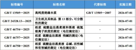 近日,國家市場監督管理總局(國家標準化管理委員會)發布關于批準發布261項推薦性國家標準公告,其中包括《衛生紙及其制品 第13部分:可分散性的測定》《紙漿 硫酸鹽法蒸煮液和黑液 硫氫根離子濃度的測定(電位滴定法)》等5項造紙領域國家標準。