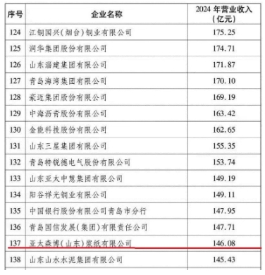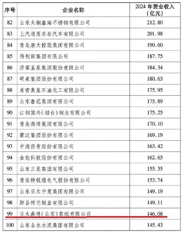 12月16日,山東省企業(yè)聯(lián)合會、山東省企業(yè)家協(xié)會聯(lián)合發(fā)布了《2025山東大企業(yè)發(fā)展研究報告》和2025山東企業(yè)200強、工業(yè)企業(yè)100強等名單。其中,亞太森博(山東)漿紙有限公司位列2025山東企業(yè)200強第137位,2025山東工業(yè)企業(yè)100強第99位。 據(jù)了解,為全面貫徹黨的二十大和二十屆歷次全會精神,落實省委、省政府關(guān)于加快培育更多世界一流企業(yè)的要求,進一步促進企業(yè)做大做強做優(yōu),山東省企業(yè)聯(lián)合會在連續(xù)二十年組織開展山東大企業(yè)發(fā)展研究工作基礎(chǔ)上,參照國際通用慣例,結(jié)合我省實際,依據(jù)企業(yè)2024年營業(yè)收入年報數(shù)據(jù)(企業(yè)集團為合并報表數(shù)據(jù)),經(jīng)企業(yè)自愿申報、山東省企業(yè)聯(lián)合會組織審核篩選,確定2025山東大企業(yè)名單,并形成《2025山東大企業(yè)發(fā)展研究報告》。