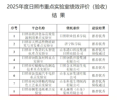 1月12日,日照市科學技術局公布了2025年度市重點實驗室績效評價結(jié)果,亞太森博(山東)漿紙有限公司牽頭建設的日照市制漿造紙重點實驗室憑借扎實的研發(fā)實力、豐碩的創(chuàng)新成果及突出的產(chǎn)業(yè)賦能成效,順利通過評價并獲推薦優(yōu)秀等次,彰顯了企業(yè)在制漿造紙領域的科技創(chuàng)新引領地位。