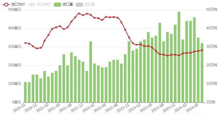 隨著國內市場廢紙回收率的提升以及供需關系,國際市場貿易政策及匯率波動等諸多因素影響,自2022年8月均價457美元/噸后,價格一路下行,2023年8月價格跌至253美元/噸,此后紙價呈現穩中偏強運行狀態,整體波動有限。最新數據顯示,2024年6月份,我國紙漿進口量為261萬噸,其中廢紙漿進口量為32萬噸,占比約為12.26%,進口均價為282美元/噸。