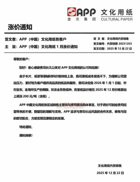 APP :由于木片、紙漿等原輔材料價(jià)格持續(xù)上漲,我司原紙成本居高不下,為緩解公司營運(yùn)壓力,更好地為客戶提供高品質(zhì)的紙品和服務(wù),我司決定自2026年1月1日起,針對金東、金海所生產(chǎn)的銅版、非涂全系各紙種、克重紙品價(jià)格在2025 年12月價(jià)格基礎(chǔ)上調(diào)漲 200 元/噸(含稅)。