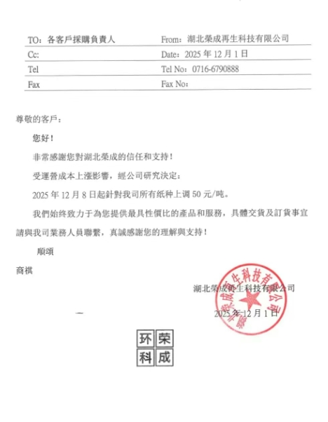 12月8日起,針對我司所有紙種上調 50 元/噸。