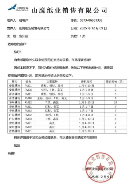 山鷹國際:7大基地共12臺箱板瓦楞紙機將在1月1-13日期間輪停5-10天,按照設計產能計算,預計削減市場供應約10.8萬噸。