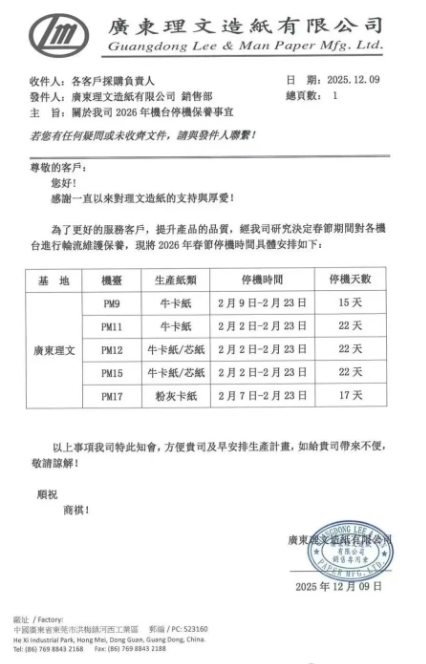 廣東理文:5臺紙機將在2月停機15-22天,預計減產箱板瓦楞紙9.3萬噸和3萬噸灰底白板紙。