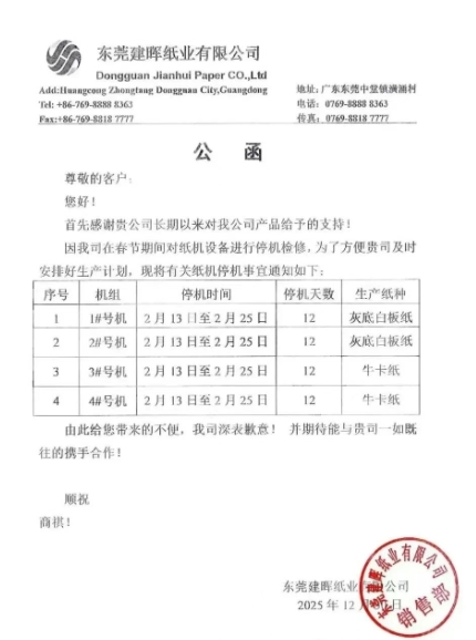 2025年12月30日,建暉紙業(yè)發(fā)布2026年春節(jié)檢修計(jì)劃,廣東東莞和廣西梧州兩個(gè)基地全部六臺(tái)紙機(jī)將在春節(jié)前后輪停10天或12天,按照設(shè)計(jì)產(chǎn)能計(jì)算,預(yù)計(jì)減產(chǎn)6.8萬(wàn)噸包裝紙 ,其中包括2.8萬(wàn)噸灰底白板紙和4萬(wàn)噸箱板瓦楞紙。
