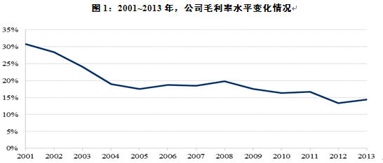 歷史上,伴隨著產能平穩增長,公司收入增速亦整體呈現平穩態勢。而2013年隨著公司75萬噸涂布白卡紙的投產,公司產能同比增長68.49%,而營業收入同比增長14.32%。同期公司新投產就白卡紙看,公司產能同比增幅為136.36%,而同期白卡紙營業收入增幅為23.10%,顯示新增產能尚處于逐步釋放階段。盈利能力方面,前期造紙行業需求旺盛并且行業競爭程度尚可,同時白卡紙屬于包裝紙行業中的高端紙種,產能較為穩定,2008年之前,公司毛利率穩定在20%左右。2008年之后,在宏觀經濟增速放緩以及白卡紙產能不斷擴張的雙重壓力下,公司毛利率水平持續走低,2013年為14.45%。2013年,公司除面臨行業層面的壓力外,自身新增75萬噸產能處于市場開拓期,公司銷售費用規模相應上升,同時,由于75萬噸產能的轉固,資本化利息費用化推高公司財務費用,在上述因素作用下,公司期間費用收入占比達到16.09%,高于同期公司毛利率水平,公司當年利潤總額為-2.16億元。整體上,在現有低迷的造紙行業尤其是白卡紙行業景氣度下,公司原有產能盈利水平低位維持,而新項目仍處于市場開拓期,其在推高公司費用的同時并未充分貢獻收入導致公司盈利能力弱化。短期內,隨著新項目產能利用率的逐步提升,公司盈利或將面臨小幅好轉。但基于白卡紙行業產能過剩的背景,公司新增75萬噸產能銷售或將面臨一定壓力,公司盈利能力難以發生實質性好轉。