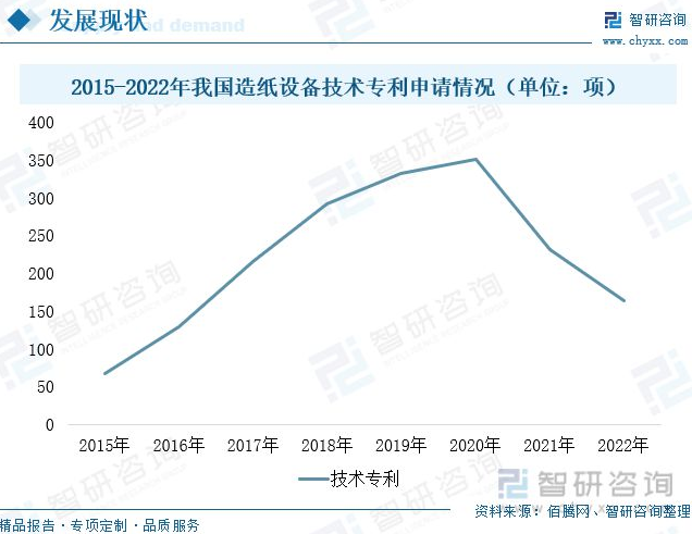 造紙設備是專業性很強的行業,涉及機械、化工、材料、防腐等多個技術性領域。我國造紙設備行業發展歷程較短,行業整體技術水平相對滯后,市場規模較小。從國際市場看,造紙設備生產商主要集中在德國、美國、意大利、日本等制造業發達地區,與國際造紙設備領先企業相比,國內造紙設備供應商在規模、技術以及質量方面,都存在較大差距,長期以來大型造紙機械設備均依賴進口。近年來,國家出臺了多項推動造紙行業技術及設備創新發展及綠色轉型政策。其中,為了提高我國造紙機技術水平,加快大中型造紙機國產化進程,國家還安排了國債支持的技術改造資金,以引進部分技術項目。在“制造強國”戰略及相關政策引導下,造紙設備行業參與者逐漸增多。隨著造紙設備生產商紛紛加大研發力度及航空、造船等跨行業投資者參與布局造紙機械設備的研發生產,行業技術水平逐步提高。截至2022年底,我國合計擁有2273想造紙設備相關專利,其中實用新型專利1670項,發明專利578項。其中,2022年新增造紙設備專利164項。并研發創新了廢紙制漿成套技術裝備、鼓式碎漿機、新型封閉篩選設備、雙盤磨漿機、超級壓光機等多種設備,設備國產化進程不斷加快。2022年我國新增造紙設備技術專利164項,較前兩年略有下滑,但與2016年之前相比仍處于較高水平,行業研究開發加快。近幾年,隨著造紙設備水平不斷提高,我國市場份額也在逐漸提升。預計,2022年我國造紙設備市場份額占全球總份額將提升至28%左右,行業國產化進程也將進一步加快。